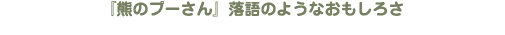 この本の面白さに一番近いのが、落語だと気がつきました。登場人物(クリストファー・ロビン以外は動物)は大まじめなのですが、言葉の行き違いとか思い違いが引き起こす事件は、端から見るとおかしいけれど変に説得力があって、どれにも必ず落ちがある。お父さんが息子とプーに、本人とその他の仲間が出てくるお話を聞かせる形なので、子ども向きに一つずつは短く終わるし、耳で聞いておもしろい。お説教っぽいところはまったくないのも気に入っていました。