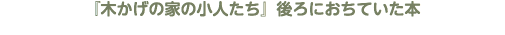 神田小学校は、明治時代に創立された伝統のある学校で、当時の校舎は、関東大震災後、昭和のはじめに建てられたものだった。転校したばかりの私が迷い込んだ図書室も、ずいぶん古びたスペースだったけれど、書棚にならんでいる本の後ろ側に、もう1冊、本がおちていた。手をいれて、取り出してみると、それが『木かげの家の小人たち』だった。