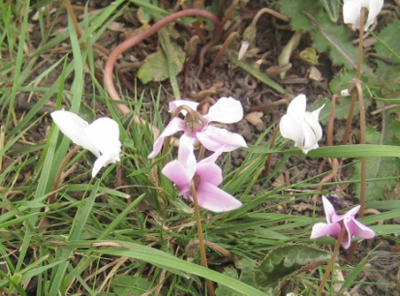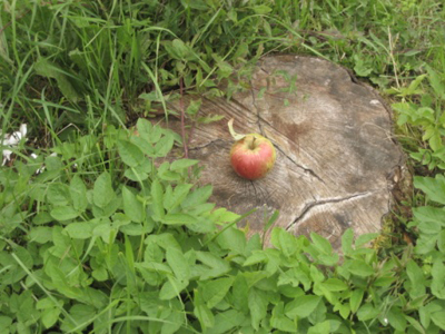 農場の裏手には、春と夏と秋が共有しているような庭がありました。カタクリとリンゴ(甘酸っぱくておいしい)がこんな具合に並んで、私たちを迎えてくれました。