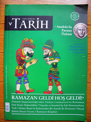 雑誌『ターリヒ(歴史)』2002年11月第107号。ラマザン(断食月)の特集で、表紙をカラギョズ(左)と相方のハジバットが飾っている。キャッチコピーは「ラマザン ゲルディ ホシュ ゲルディ!(やってきたぞラマザンが、待ちに待ってたラマザンが!)」(©Türkiye Ekonomik Toplumsal Tarih Vakfı/トルコ社会経済歴史基金)
