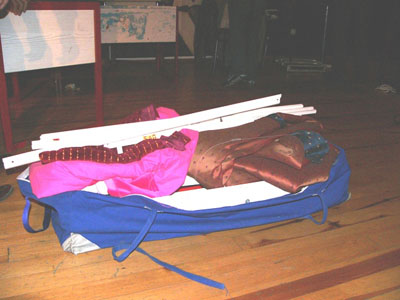 役人を見ると、カラギョズ師たちは道具一式を抱えて逃げだした。その名残りで舞台は組み立て式になっており、分解すると大きめのスポーツバッグに入ってしまう。ちなみに、今日のトルコでも、違法な露天商が見回りの警察官を見つけたときの逃げ足は、速い。
