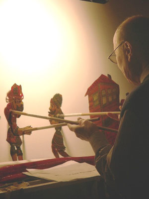カラギョズとハジバットを同時に操るタージェッティン氏。声色を出しているほうの人形の頭を細かく動かすことで、話の順番を表現する