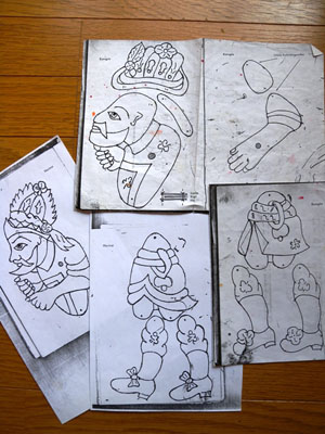 タージェッティン氏にコピーさせていただいた、カラギョズとハジバットの型紙。複雑な接合部分には番号がふられ、糸のとめ方が記されている
