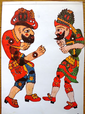 人形は30~40センチの大きさで、彩色した革でつくられている。革は光をとおすようになめされ、透明度が高い。水牛、ラクダ、牛などが用いられるが、なかでも彩色や光をとおす透明度にはラクダ革がいちばん適しているといわれる。