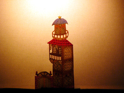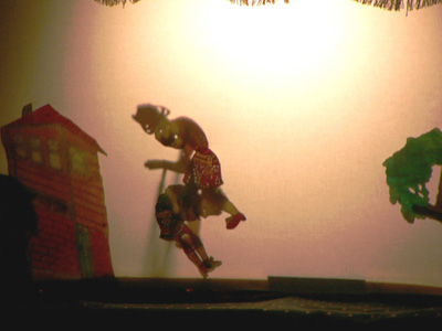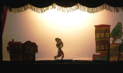 人物が登場するまで、スクリーン上には「ギョステルメリッキ(予告絵)」が飾られている。本来は、上演内容を予告するもので、家、花、船、などの種類がある。写真は、タージェッティン氏のギョステルメリッキ