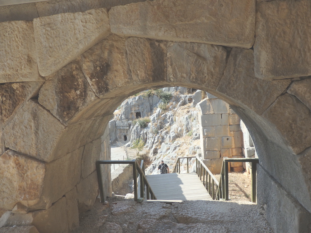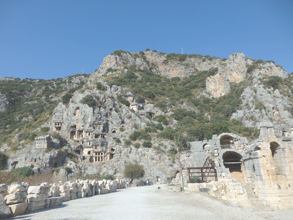 車を降り、土産物の並ぶ中をぬけていくと、ミュラの古代劇場の向こうにネクロポリスが見えてきます。