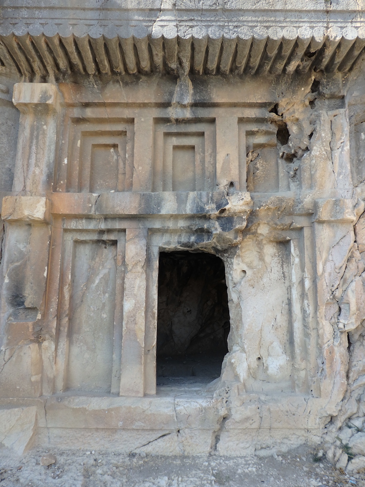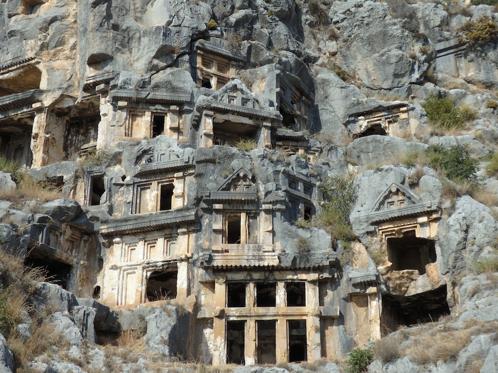 ミュラのネクロポリスは、断崖の岩をくりぬいて石室とし、穴の周りには神殿の入り口のような装飾がほどこされています。