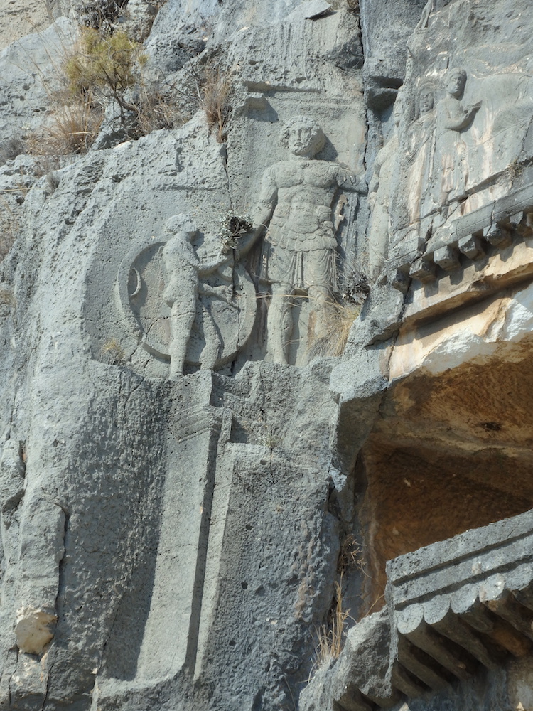 こうした岩をくりぬいた墓地はリュキア独特のものと言われます。ミュラのように崖をくりぬいたものもあれば、現トルコのムーラ県フェトヒエに残るクサントス(リュキアの古代都市。リュキアの文化と商業の中心地)のように、石柱の上に屋根がついた家形の石棺を乗せた形のものもあります。トルコのエーゲ海、地中海沿いにはリュキアの都市国家の遺跡がずらりと残っているので、ネクロポリスも多く発掘されています。