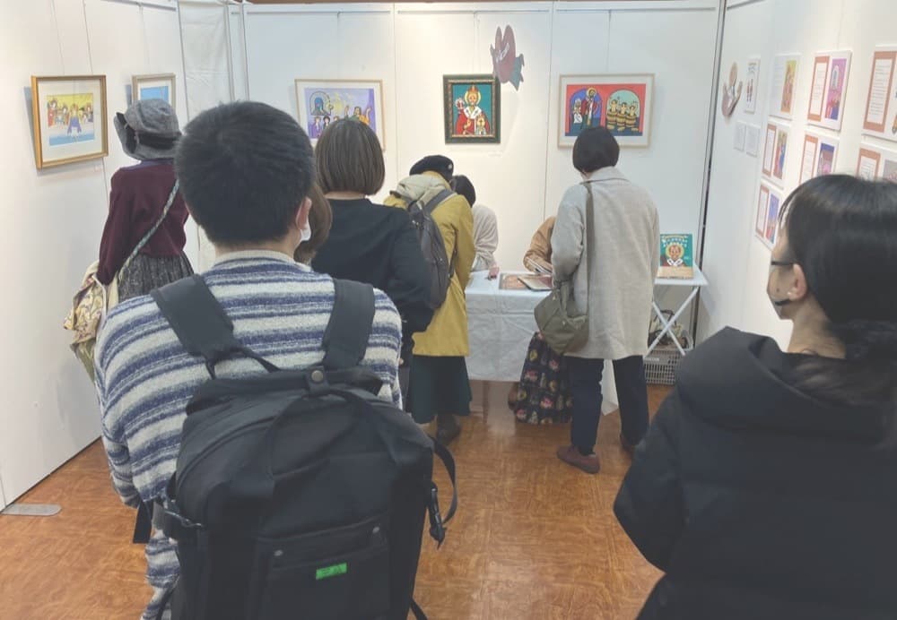 会場では絵本のパネル展示のほか、絵本のイメージ画として制作された原画や、吉田稔美さんのシルクスクリーン作品、ポストカードなどの展示販売、空飛ぶ聖ニコラウスの飾りなどが展示されました。