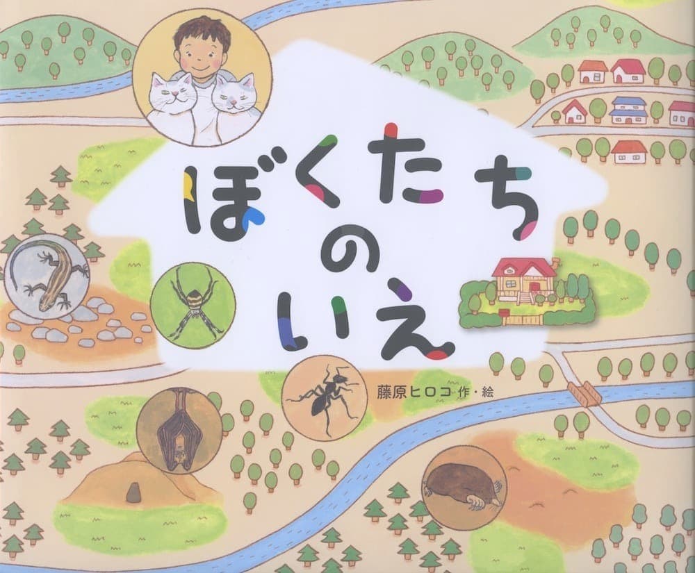 この絵本はそんな夢をかなえてくれます。主人公のぼくが、2匹のネコをおともに、クモ、アリ、モグラ、コウモリ、トカゲ、カエル、アメンボ、ドジョウ、チョウ、ハチ、リス、カラスの家をたずねます。